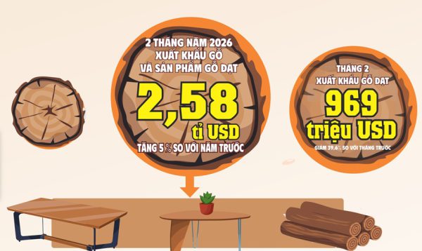 Xuất khẩu gỗ Việt Nam 2 tháng đầu năm 2026 đạt 2,58 tỉ USD, Hoa Kỳ dẫn đầu, Trung Quốc tăng mạnh 48,5%