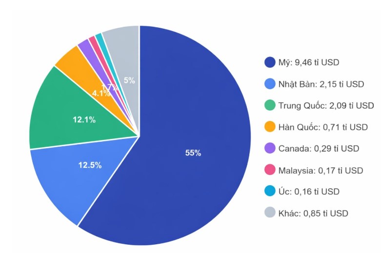 Tăng trưởng đạt được trong bối cảnh thị trường quốc tế còn nhiều bất ổn. Tổng hợp từ Cục Lâm nghiệp Kiểm lâm và Hiệp hội Gỗ và Lâm sản Việt Nam (Viforest), cho thấy Mỹ vẫn là thị trường chủ lực, chiếm gần 55% kim ngạch, theo sau là Nhật Bản và Trung Quốc. Một số thị trường EU như Tây Ban Nha ghi nhận mức tăng trưởng đột biến (tăng trên 60%), bất chấp áp lực từ các quy định môi trường mới.