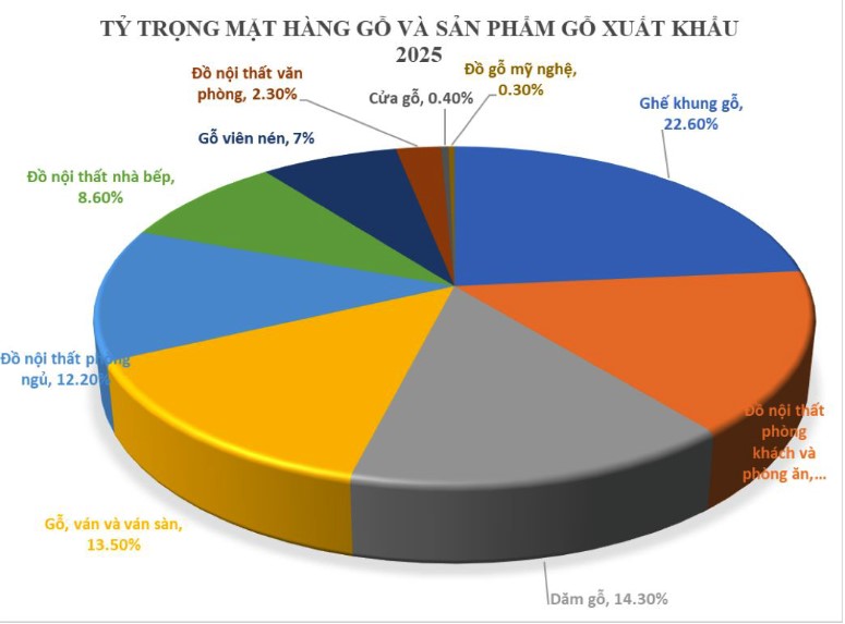 Về cơ cấu mặt hàng, đồ nội thất tiếp tục đóng vai trò trụ cột, trong đó ghế ngồi khung gỗ mang về hơn 3,5 tỉ đô la Mỹ. Viên nén gỗ trở thành điểm sáng khi tăng gần 50%, trong khi dăm gỗ dù suy giảm nhẹ vẫn chiếm tỷ trọng đáng kể trong tổng kim ngạch.