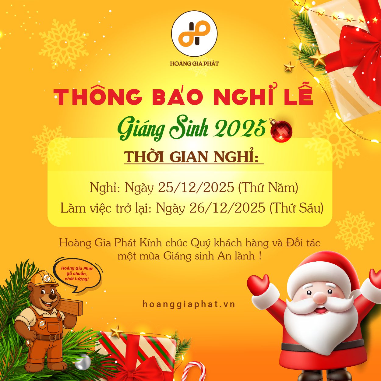Công ty Hoàng Gia Phát xin thông báo đến Quý khách hàng, đối tác lịch nghỉ lễ Giáng sinh 2025 cụ thể như sau: