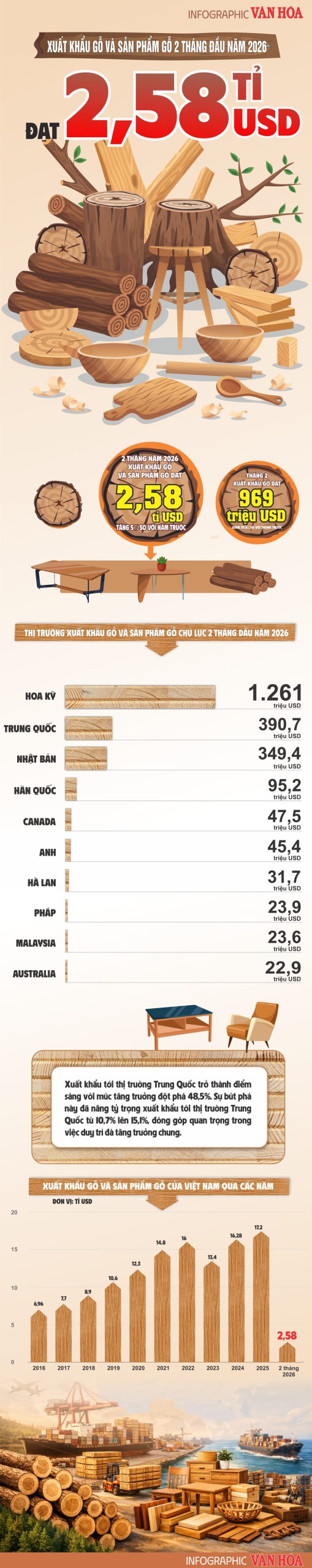 Xuất khẩu gỗ Việt Nam 2 tháng đầu năm 2026 đạt 2,58 tỉ USD, Hoa Kỳ dẫn đầu, Trung Quốc tăng mạnh 48,5%